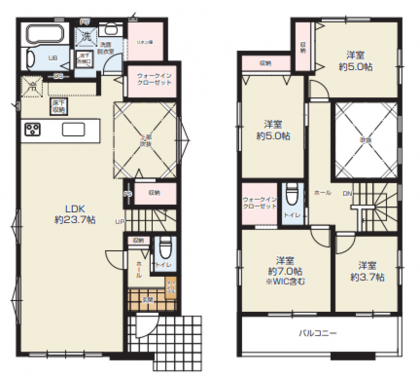 - システムキッチン、カウンターキッチン、食器洗浄乾燥機、IHクッキングヒーター、オール電化、シャンプードレッサー、洗浄便座、浴室乾燥機、追い焚き、複層ガラス、ウォークインクローゼット、モニタ付インターホン、駐車場2台分、床下収納、エコキュート、トイレ2箇所
